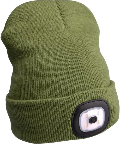 EXTOL sapka, zöld, kötött, kivehető LED homloklámpával, 4x45 Lumen; USB tölthető Li-ion akku, 3 funkció (100-75-50 fényerő)